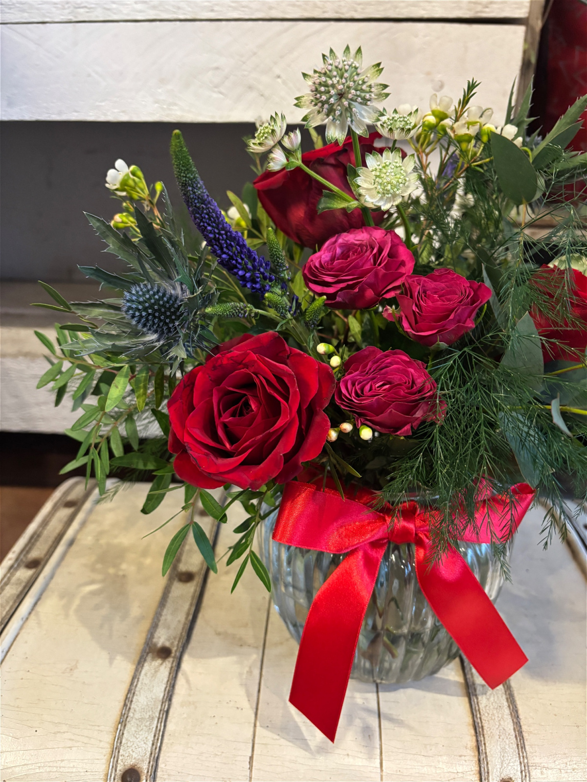 Our small Jar filled with a Posy in Reds and Whites. To include at a minimum of one Single Red Rose and other flower.